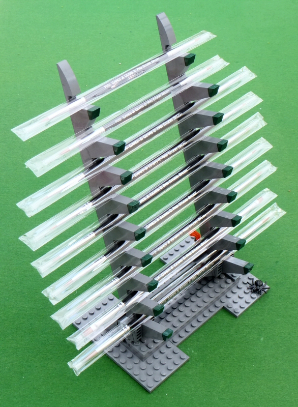 A couple of weeks ago I received my brushes from the Games & Gears Kickstarter. I've not tried them out yet, but will post a review when I get round to them. However, I did get a chance to make a Lego brush holder, inspired by the Samurai brush holder that Games & Gears will be shipping in the next couple of months. If anyone missed the Kickstarter and wants to get a set of the Pro Studio brushes, I'll have a few sets to sell on the Oubliette stand (P39 in the Palace Suite) at the UK Games Expo next weekend.